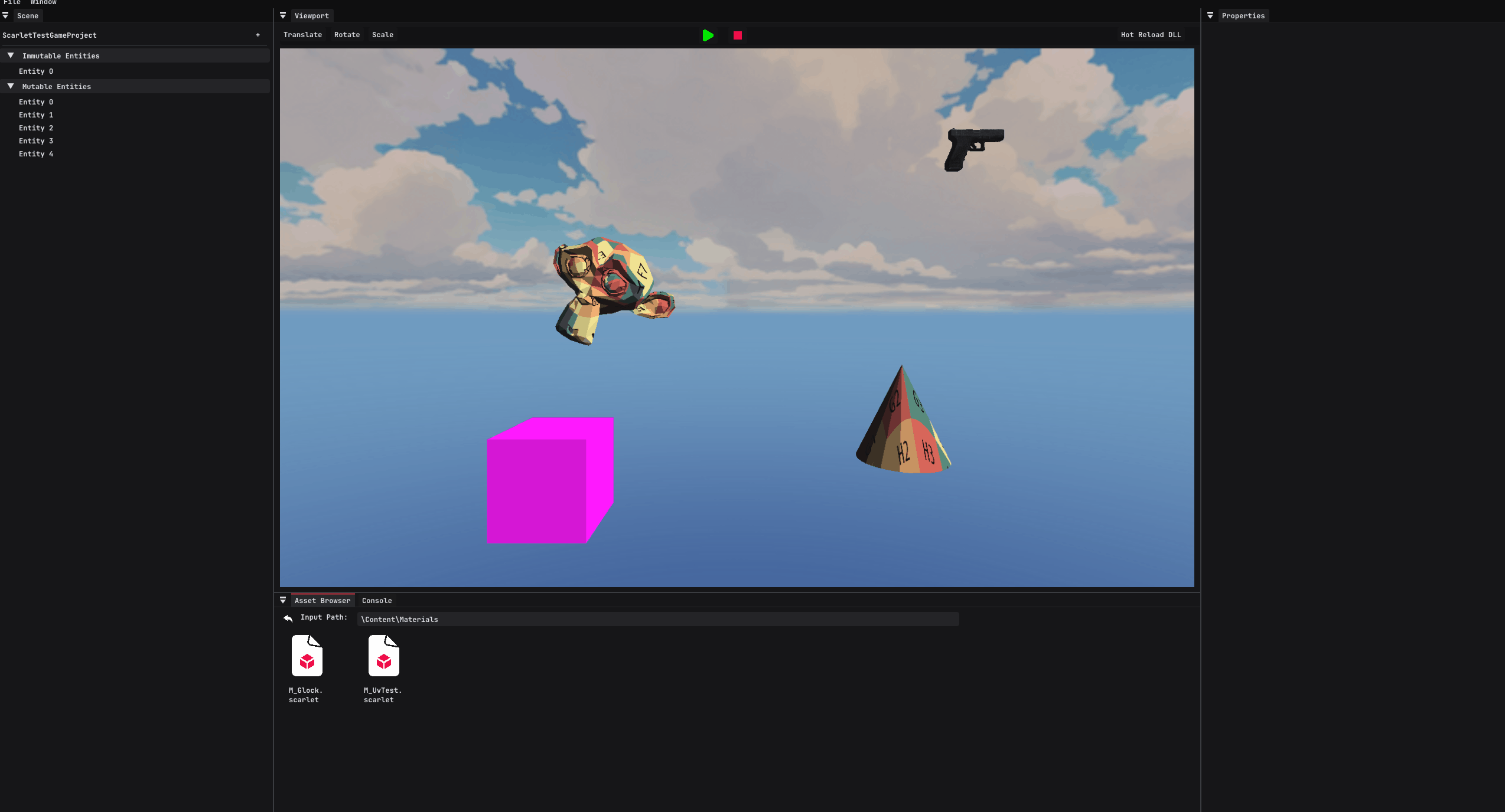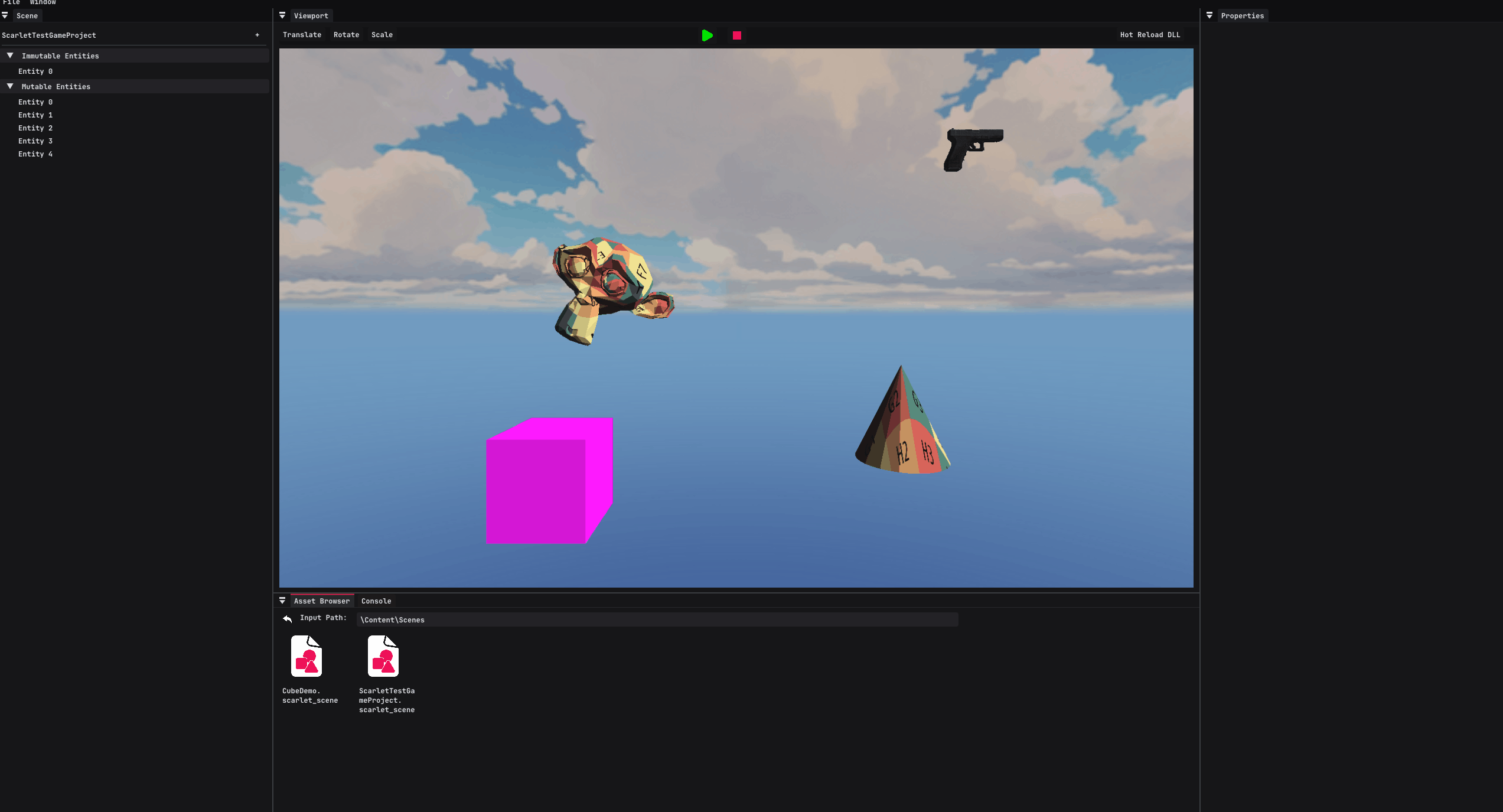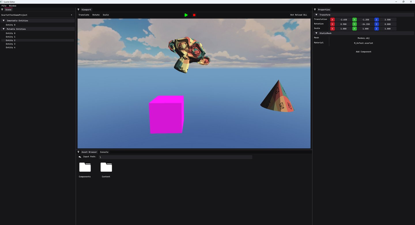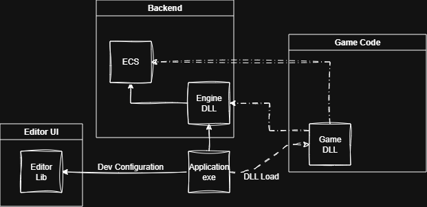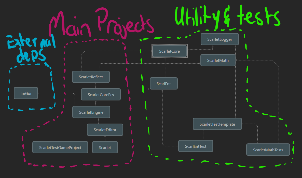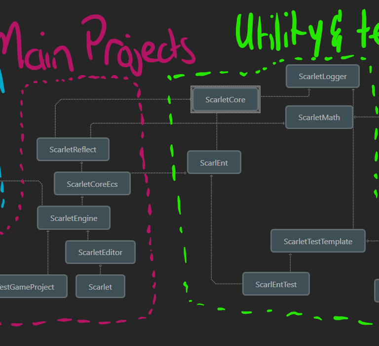The projects are broken down in such a way that allows for the code to be loaded in modularly when needed. The main goal was to separate the gameplay code of the Scarlet Project from the engine and backend. This allows for the game code to be altered and then hot-reloaded in.