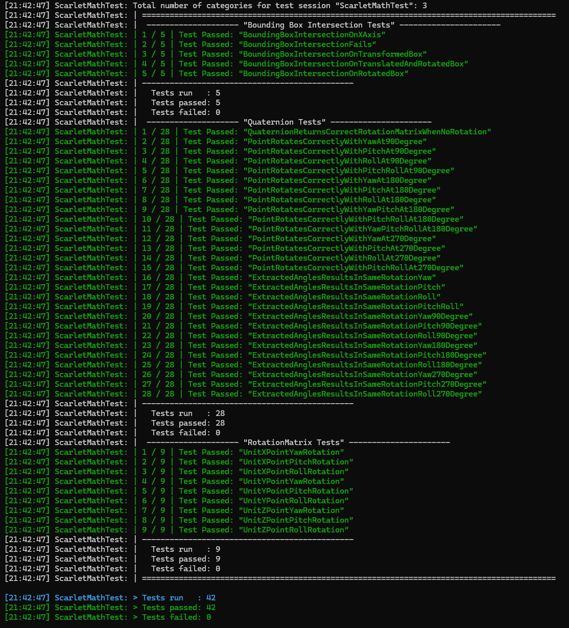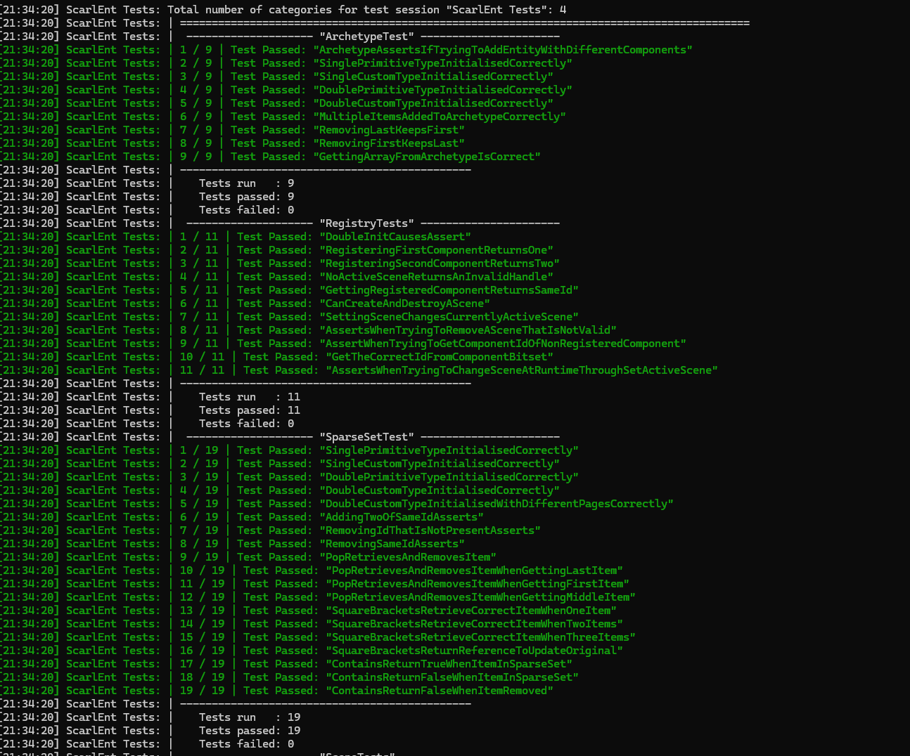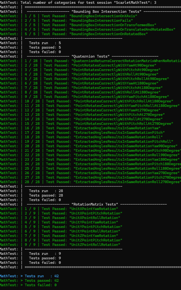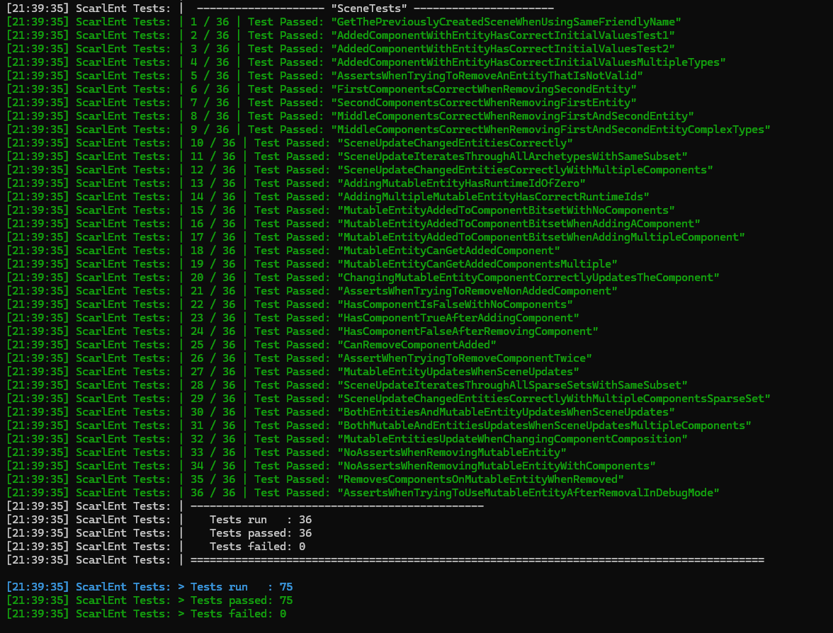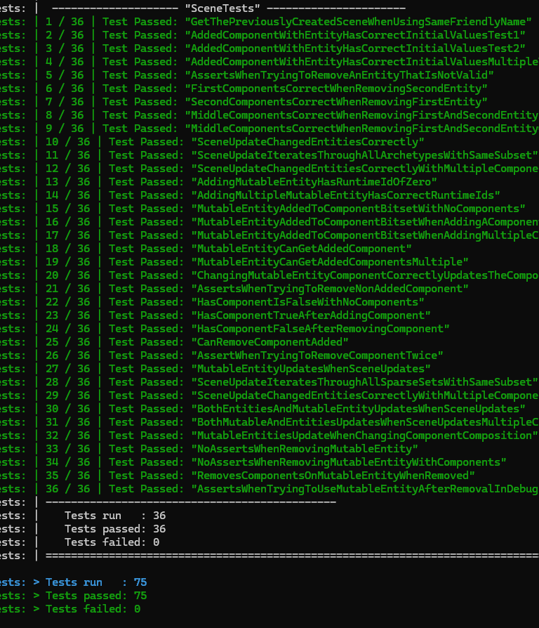 In the solution, there are multiple projects used to create test cases for the implemented structures and ensure that correct behaviour is followed. This is used extensively during development to ensure that the systems programmed will run as expected, in addition to prevent future regressions when adding new features that test cases and situations are valid before submission.