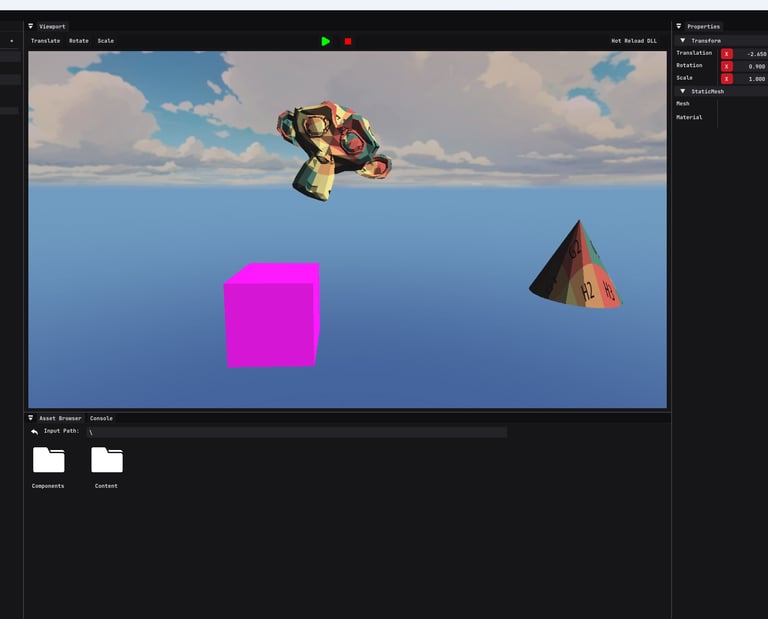 The editor also features a game simulation within the actual viewport. Starting the simulation removes all editor systems (viewport camera etc.) and attaches the game systems, showing simulations exactly as if the runtime game was being played. Once finished, the scene can be reloaded back to its original state.